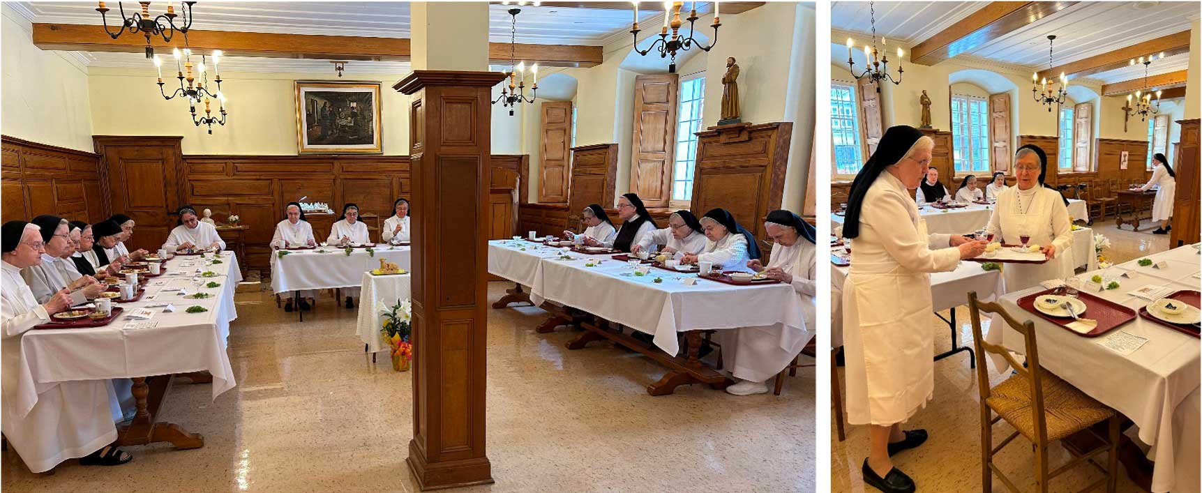 À la fin du repas, accompagnées du chant de Robert Lebel « Comme Lui, savoir dresser la table… nouer le tablier », la supérieure et l'assistante ont distribué à chaque sœur une coupe de vin et un morceau de pain. Les sœurs se sont ensuite retirées en silence.